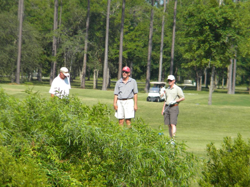 Highlight of the tournament had to be the third day of competition. Brother Rick Marshall teed up his ball on the first tee, addressed it (with the obligatory “hello ball”) and reared back, taking as mighty a swing as he could muster and duck hooking the ball into a clump of trees off the left side of the fairway. A short search ensued and Crissy found Rick’s ball in the woods with an opening between two trees towards the green (could have been four trees, after all we WERE drinking). After validating his opinion with Cuz and Fred, Crissy turned to ol’ Ricky boy and said “Yo cuz n law, you GOT this shot“. Taking out his trusty 3-wood and pulling a long draw off of his cheap Tampa Nugget, the Rickster looked at the opening and declared “Dang right, I can do this, I got this!” Cuz and Freddy echoed his declaration with a couple of encouraging dang rights of their own!